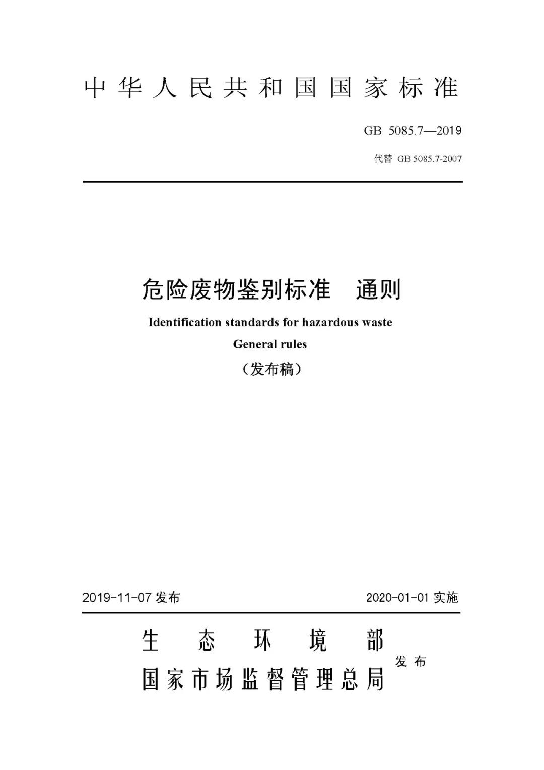 關(guān)于發(fā)布《危險廢物鑒別標(biāo)準(zhǔn) 通則》(GB 5085.7-2019)的公告