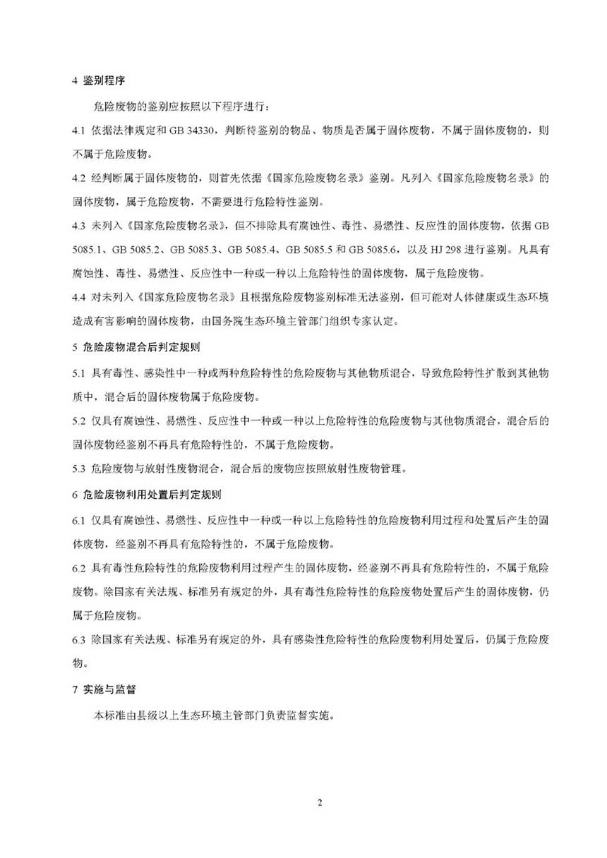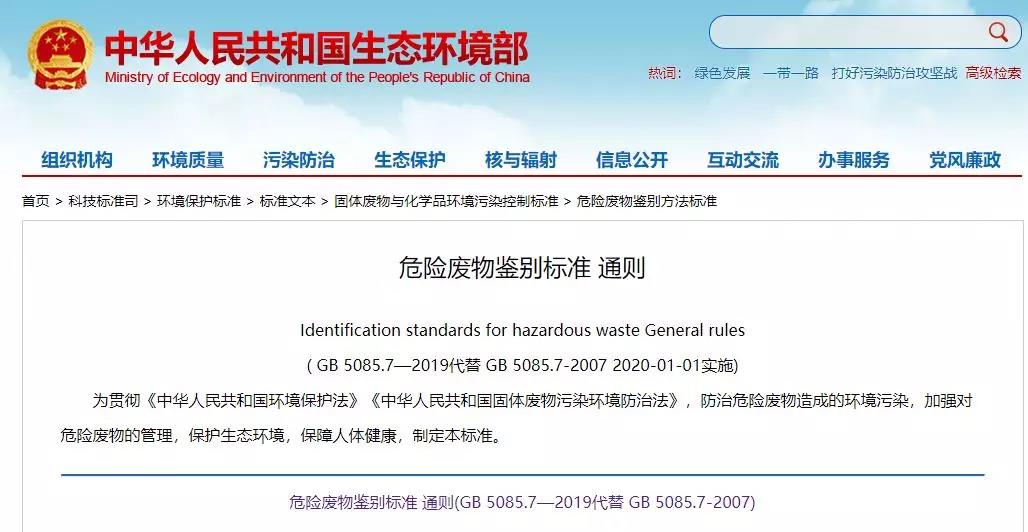 生態(tài)環(huán)境部發(fā)布《危險廢物鑒別標(biāo)準(zhǔn) 通則》(GB 5085.7-2019)