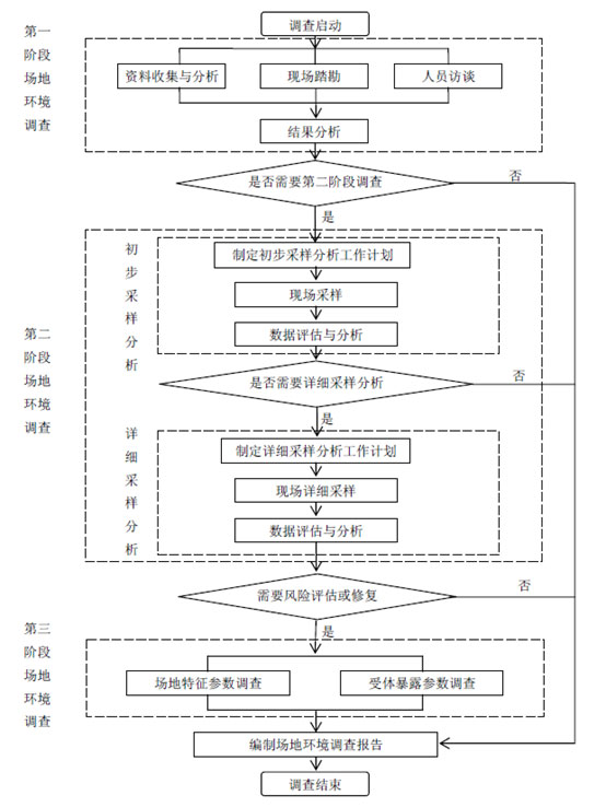采用系統(tǒng)的調(diào)查方法,確定場地是否被污染及污染程度和范圍的過程; 場地環(huán)境調(diào)查可分為三個(gè)階段,調(diào)查的工作程序如下圖所示: